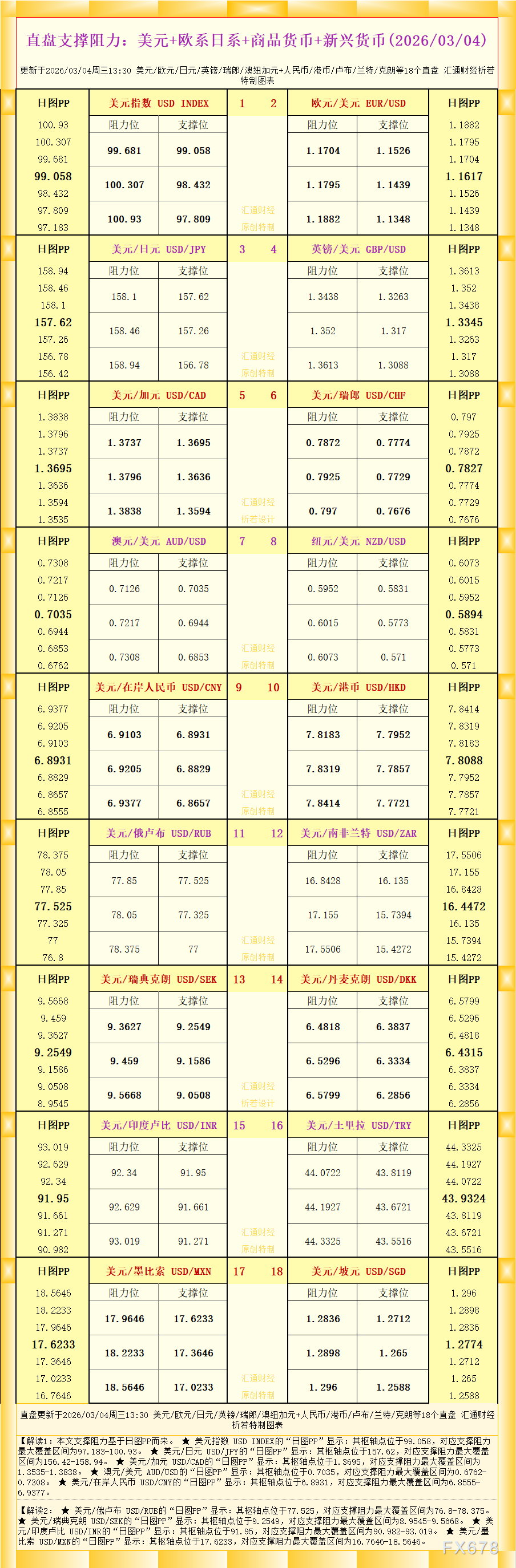 汇通财经APP讯——一张图看直盘支撑阻力:美元+欧系日系+商品货币+新兴货币,更新于2026年3月4日周三13:30,具体美元/欧元/日元/英镑/瑞郎/澳纽加元+人民币/港币/卢布/兰特/克朗等18个直盘,更多详见汇通财经析若特制图表中的内容。