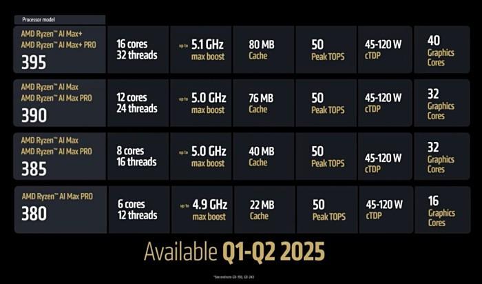 锐龙 AI Max 系列的 CPU 部分基于 Zen 5 架构,GPU 则就 RDNA 3.5 架构打造,其最顶级的型号为锐龙 AIMax+395,采用 16 核心 32 线程设计,最高加速频率为 5.1GHz,80MB 的缓存,50TOPS 算力的 NPU,40 单元的 RDNA3.5 架构核显,比一般核显规模大了几倍,而且显存位宽可达 256GB/s,能够提供比锐龙 AI 300 系列更强大的图形性能。